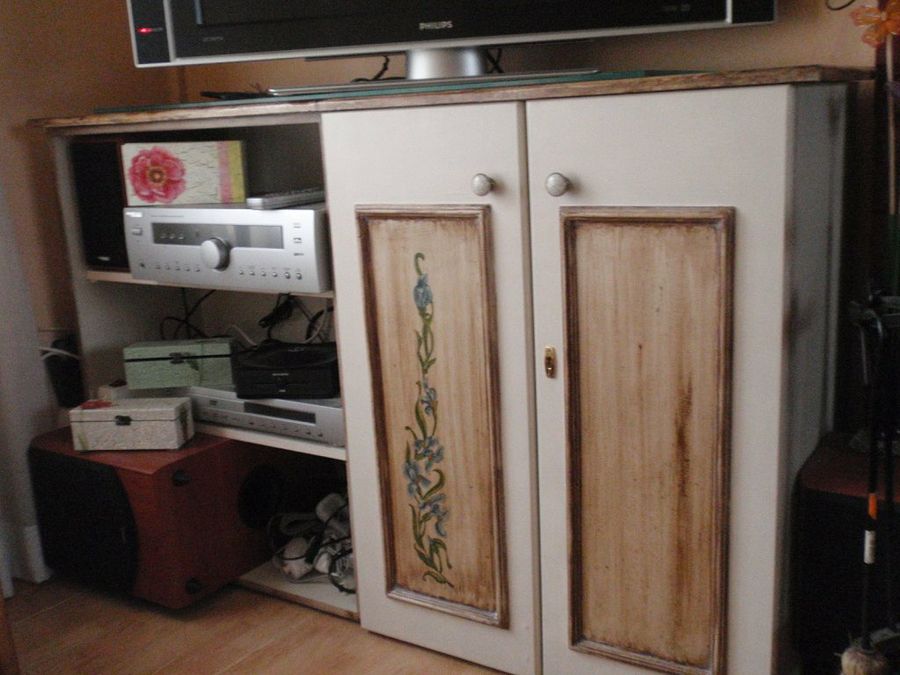 La original idea de Maijo_s fue ensamblar dos armaritos de cocina para hacer el mueble de la televisión. Lo que ella denomina su "primer trabajito" quedó realmente bien, y el tuneo agradó mucho a Felipe, gran aficionado a las propuestas modernas en los muebles televisivos. Una cuidadosa pátina remata el acertado trabajo con los pinceles.