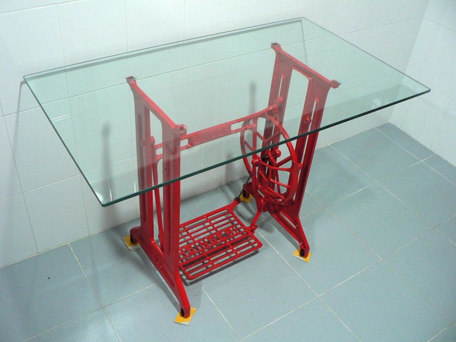 ¡Seguro que a los altos directivos de la Singer les gustaría tener esta mesa en su despacho! Nuestro amigo Mad2 es el autor del espléndido tuneo. La tapa de cristal y el pie pintado de rojo otorgan un aire muy alegre y moderno a la mesa, que por cierto se fabricó en 1872, de modo que pronto cumplirá los 140 años con un aspecto inmejorable.