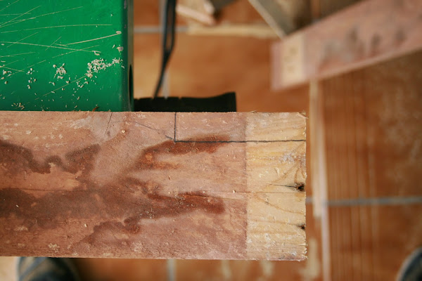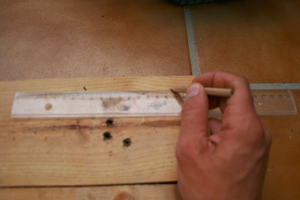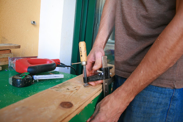 Bien, ya tenemos definidas las medidas y las piezas que lo componen. Es hora de empezar a currar. Comenzamos marcando las tablas para cortar a la medida correspondiente. Para ello fijamos el listón a cortar mediante sargentos o gatos a la mesa de trabajo, nos será más fácil y seguro. Nos ponemos las gafas de seguridad y ... ¡¡ A cortaaarrr!!