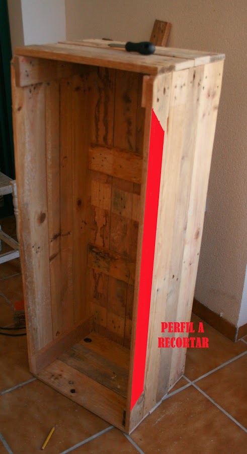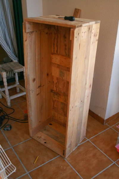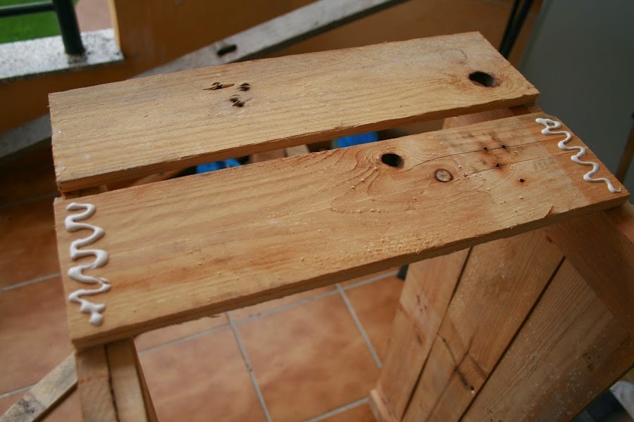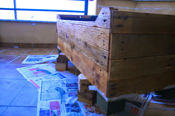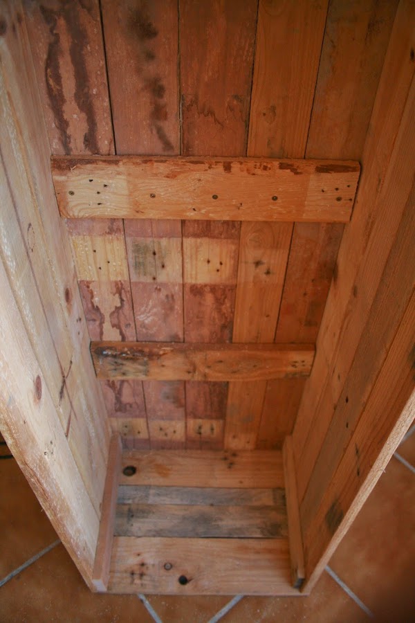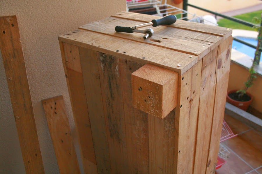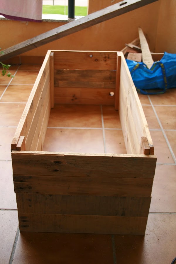 Ya tenemos nuestra caja ensamblada. No podemos dejar que la caja apoye en el suelodirectamente por motivos de suciedad y humedad. Vamos a aprovechar los tacos del mismo palet para fabricar unas patas en un PIS PÁS.