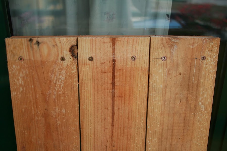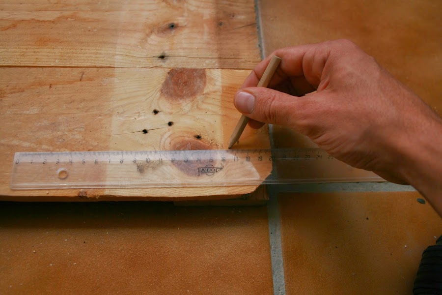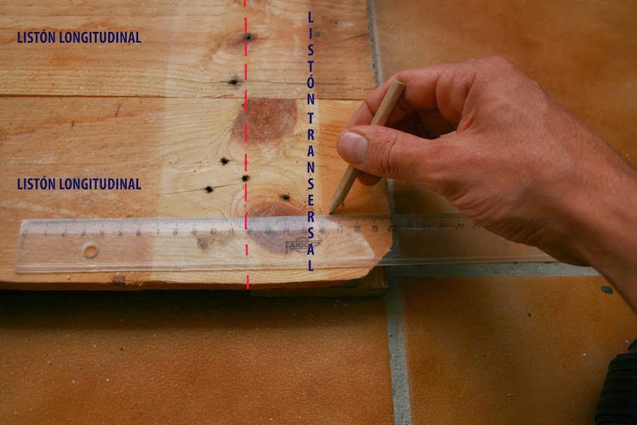 Colocamos los listones sueltos y marcamos con exactitud la medida a cortar. Deberán cubrir la superficie entre las otras tapas, es decir, deberán ir embutidos. Si no queréis desesperar, os aconsejo ejecutar este paso al milímetro. Arrancaremos la colocación empezando por un lateral hasta acabar en el otro. Marcamos, cortamos y atornillamos. Una vez colocado el primero haremos lo mismo con el segundo y así sucesivamente hasta acabar con el último.
