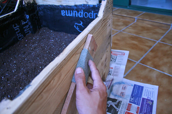 Nuestro macetero está listo. Es hora de impermeabilizarlo y para ello usaremos tela asfáltica, disponible en ferreterías, almacenes de construcción y en el garaje de Jesús. Forraremos el interior del macetero. Necesitaremos 1,58 m2 de tela asfáltica en el caso de las medidas de este macetero en particular. En caso de medidas diferentes deberéis calcularlo.