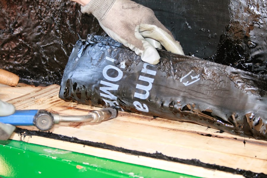 Colocaremos la pieza en su cara respectiva, encenderemos el quemador y levantaremos la tela asfáltica como si de una alfombra se tratara y quisiéramos guardar el polvo bajo ella, solo que en lugar de eso iremos calentando la tela asfáltica con el soplete hasta que se observe un mínimo burbujeo de la misma, será cuando apoyaremos la superficie de la tela sobre la madera y palmearemos levemente con la mano abierta por la parte de arriba de la tela( siempre con guantes resistentes a calorías) para que la tela se vaya adhiriendo a la madera.