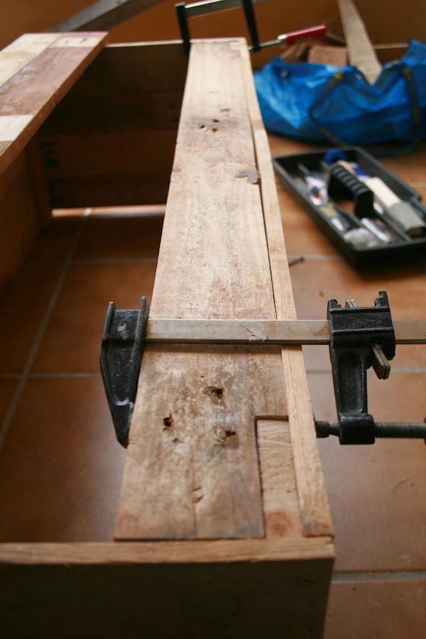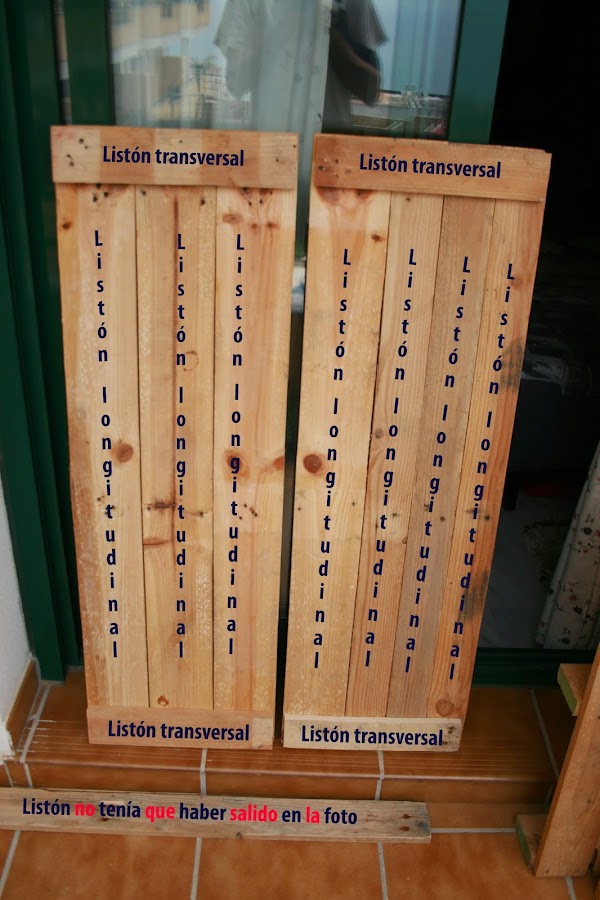 Una vez colocados todos los listones de la tapa inferior, crearemos un par de refuerzos sobre la misma, usando dos listones colocados transversalmente a los listones de la tapa y cortados con el ancho de esta.