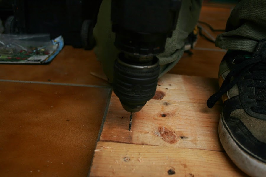 Ahora taladramos con una broca de madera de la misma medida del tornillo que usaremos, eso nos servirá de guía para el tornillo y evitaremos que la madera abra o parta al introducir el tornillo. Realizamos 2 guías por cada listón longitudinal. Para taladrar situaremos el listón long. sobre el transv.
