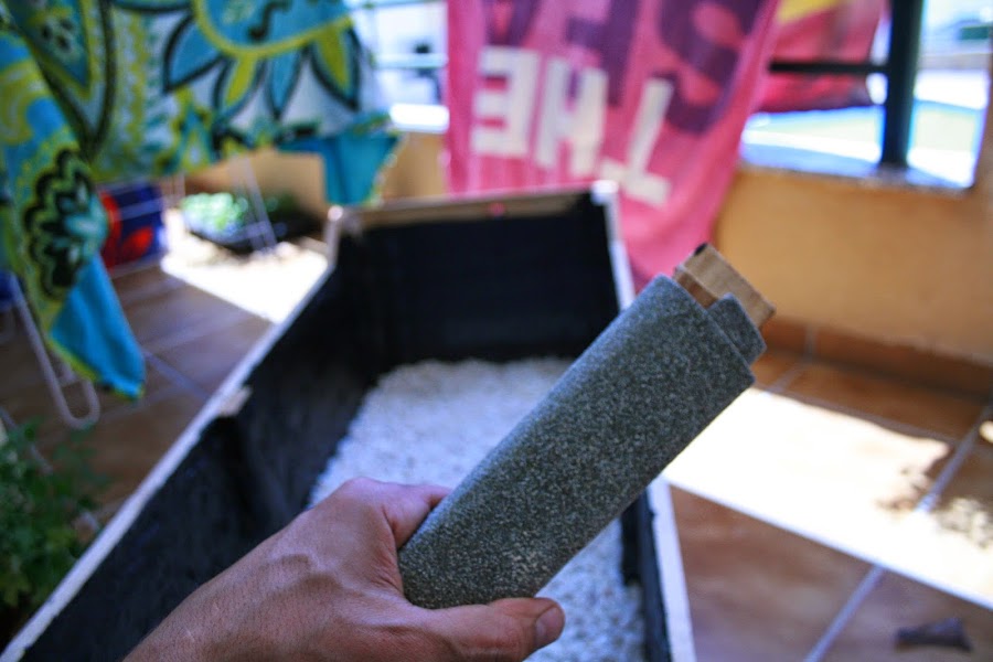 Una vez tengamos forrado el interior, deberemos practicar algún agujero en la tapa inferior que sirva de drenaje al macetero. La tela asfáltica es impermeable por lo que el macetero sería estanco de no existir drenaje ( Estanco no quiere decir que venda tabaco, sino que retiene el 100% de líquidos). Al retener el agua, cualquier planta que plantáramos aquí duraría poco ya que sus raíces se pudrirían debido a la humedad constante, a no ser que elijamos plantas que sobreviven en contacto directo con agua todo el año.