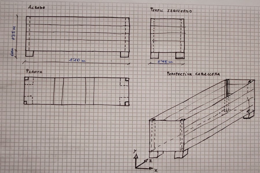 PRIMER PASO: Plasmar idea en papel Debemos disponer de un croquis previo. Insisto mucho en ello ya que es parte fundamental en cualquier tipo de proyecto que implique un diseño o planificación. Mediante un croquis conseguimos plasmar nuestra idea en papel, consiguiendo una representación de la misma, a través de la cual empezar a trabajar y observar posibles fallos de diseño. En este croquis anotaremos medidas y realizaremos modificaciones de diseño, funcionalidad, etc. Pare realizar un croquis no se usan reglas ni escuadras, deberá realizarse a mano alzada. Una vez realizado nuestro croquis, podrá realizarse un plano o una serie de planos más detallados a partir de éste, aunque para este tipo de proyectos (de andar por casa) no necesitaremos planos. El croquis se puede realizar de varias maneras. Dependiendo de lo que se quiera representar puede valer con 1 simple vista superior o en 2d, o se deberán realizar tantas vistas como la pieza u objeto a representar requiera. En el caso de este macetero use 3 vistas ( ALZADO = vista en 2d de la cara más representativa de la pieza, PERFIL IZQ = Vista en 2d del perfil izq. de la pieza y PLANTA = vista en 2d de la cara superior de la pieza) y una perspectiva caballera (3d). Con estas vistas tengo perfectamente definidos todos los detalles de mi macetero.