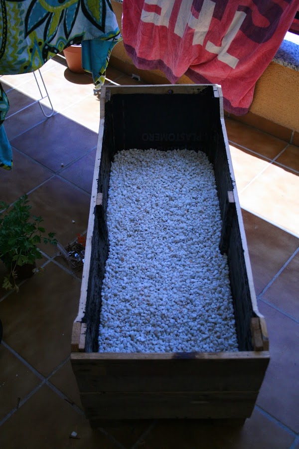 Una vez realizados los agujeros pertinentes ( con tres o cuatro bastará), rellenaremos aproximadamente 1/4 del macetero con piedra de machaqueo de 15mm aprox, que nos servirá de drenaje del sistema y evitará que la tierra húmeda tapone los orificios del fondo y evite la salida del agua.