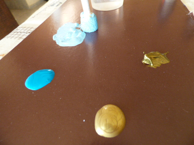Y una vez seca la pintura, trabajé con 4 colores: un azul turquesa, otro azul más claro, un tono bronce y un dorado