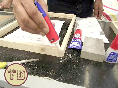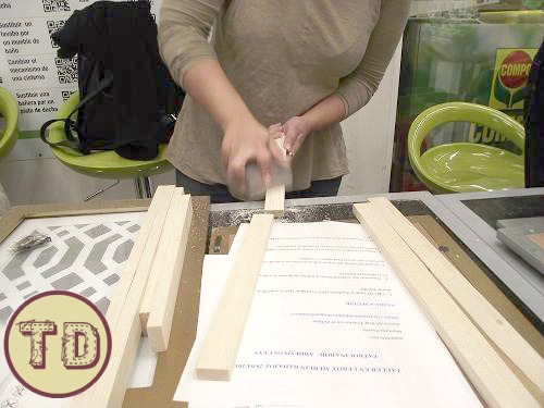 Lo primero que hay que hacer, como siempre que trabajamos con maderas crudas, es lijar y lijar hasta conseguir que la superficie sea uniforme y suave al tacto. Después, usando el adhesivo de montaje, pegamos las cuatro tablas. Lo ideal, en realidad, es cortarlas a inglete, pero en este caso la tienda no podía hacerlo y las tuvimos que poner así.