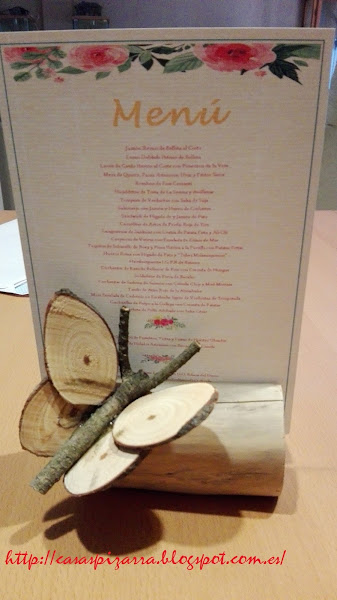 Este verano hicimos unas cosillas para una boda, una de ellas fue un soporte para colocar los menús en las mesas del banquete, eran unos tramos de rama de pino con una hendidura en la que colocar el papel, pero la cosa quedó un poco sosa y en algún sitio vimos mariposas de madera, así que decidimos colocar una mariposa en cada soporte, algunos llevaban dos, la cosa quedó así: