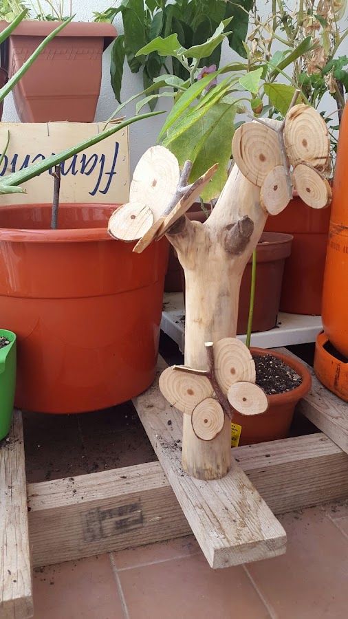 Semanas más tarde nuestra amiga Alba, las vio y me pidió que le hiciera algo con ese tipo de mariposas, cuando encontré un huequecillo cogí un tramo de tronco de pino y le agregué unas mariposas.