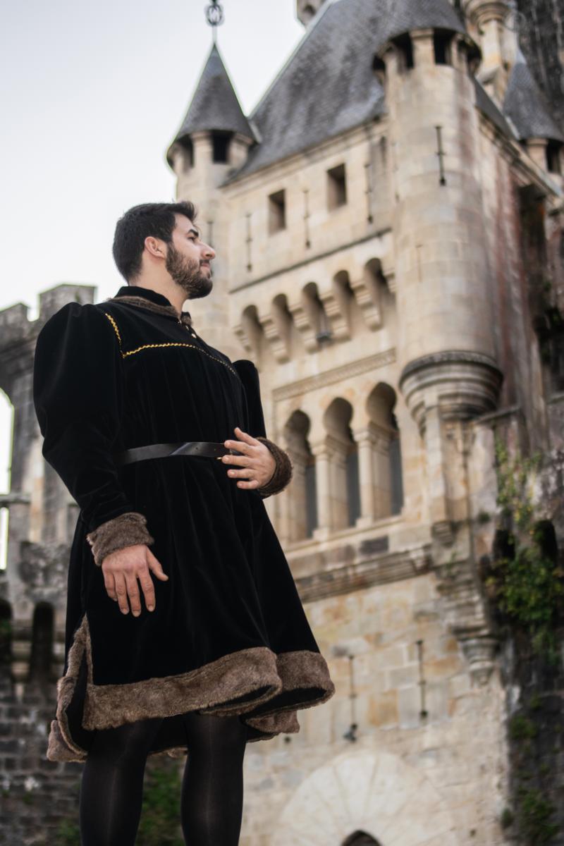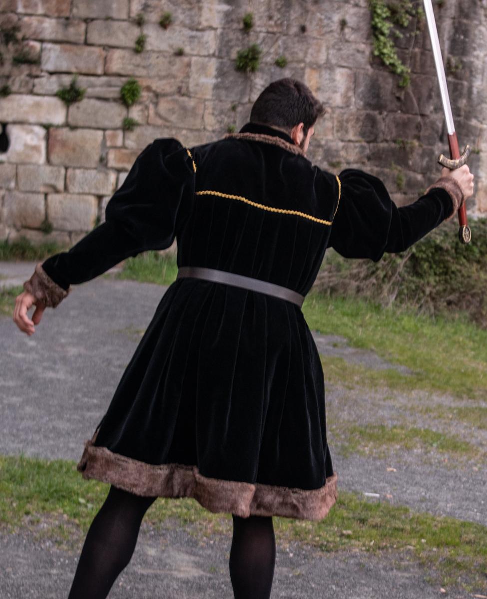Se realizaba en variedad de ricos tejidos y podía ir forrada. Este se ha confeccionado en terciopelo negro con ribetes dorados y en piel, de volumen amplio, cae formando pliegues sobre el cuerpo ciñéndose a la cintura.