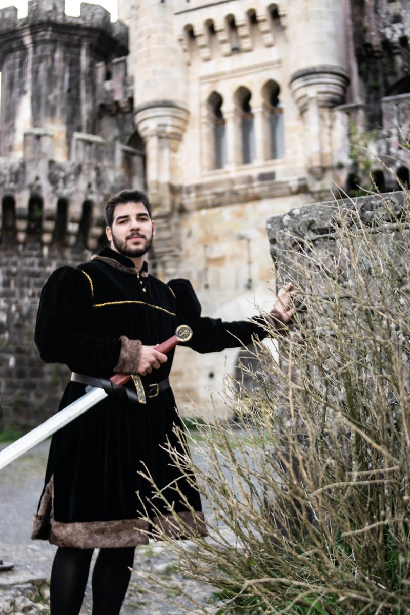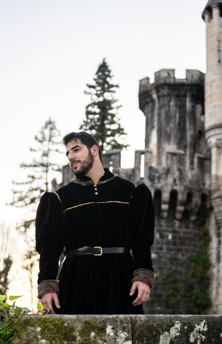 Lleva ropa a la borgoñesa por el ancho de los hombros que produce el volumen de las mangas, hoy conocidas como tipo “jamón”. La ropa era una prenda de a cuerpo que solía llevarse sobre el jubón. Muy similar al sayo pero previa en su aparición y sin corte en la cintura.