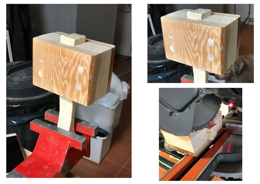 Con la ingleteadora hice dos cortes a 90º al igual que los dos trozos de madera de pino que irán dentro del "sandwich".