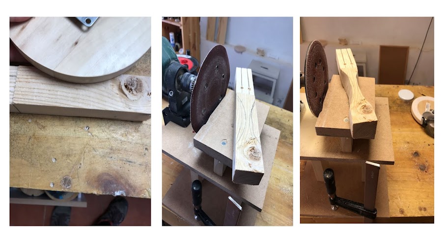 Con el taladro-lija y el soporte que yo misma me hice con madera MDF (puedes verlo ) le dí forma a la empuñadura utilizando un perfil redondeado.