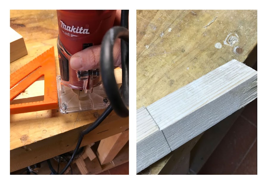 Para la empuñadura utilicé un listón de pino sin cepillar. Marqué hasta donde iría el mazo en sí y rebajé uno de los dos lados con la fresadora . Me ayudé de la escuadra rápida para marcar hasta donde debía llegar el rebaje.