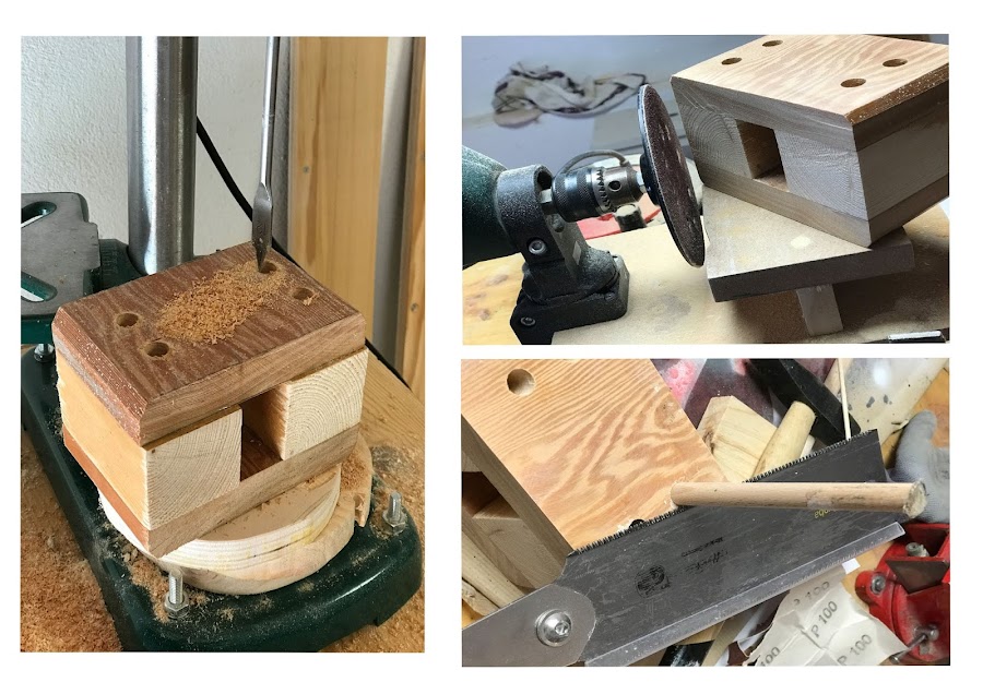 Con el taladro de columna y una broca de pala de 12 mm hice cuatro perforaciones en cada cara para darle un toque estético, además de cuatro puntos más de apriete para el sandwich. Con el taladro-lija lijé todo el mazo y quité las imperfecciones que había. Después introduje 4 varillas utilizando cola rápida y un martillo de goma. Corté el sobrante con la sierra japonesa y volví a pasarlo por el taladro-lija