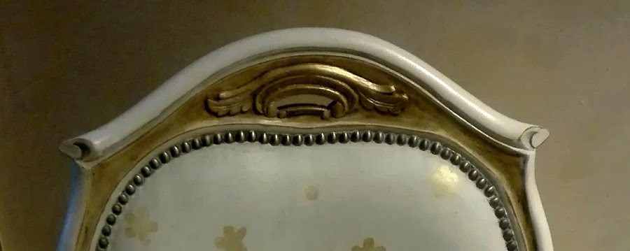 La parte de arriba, como se ve, tiene un detalle en madera tallado pintado en oro viejo, esa parte estaba realmente bien, así que prácticamente está igual, solo necesitaba un pequeño decapado.