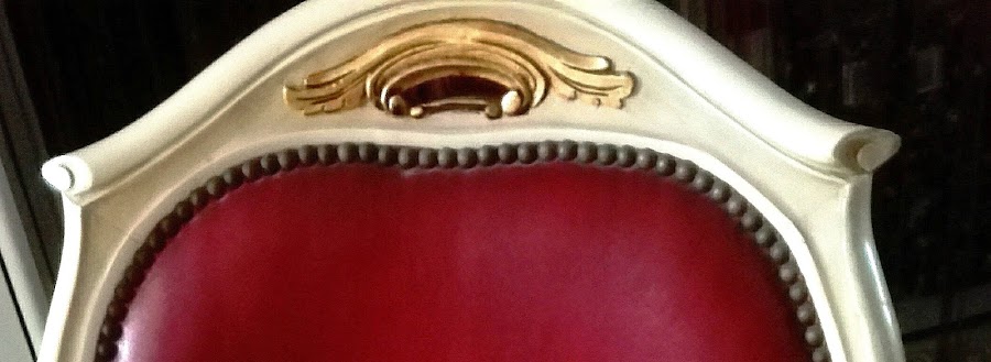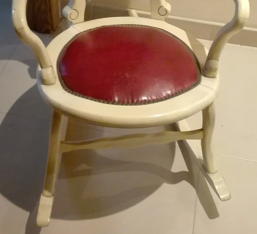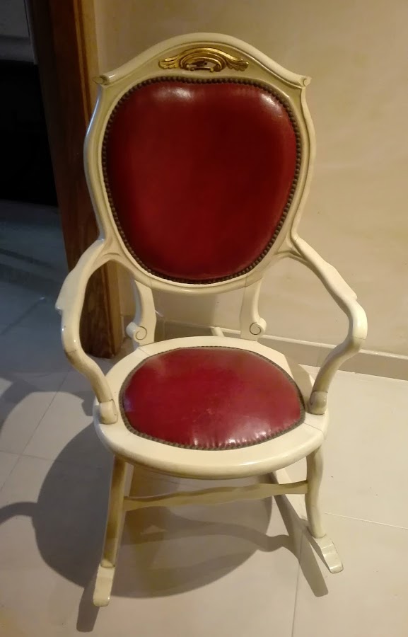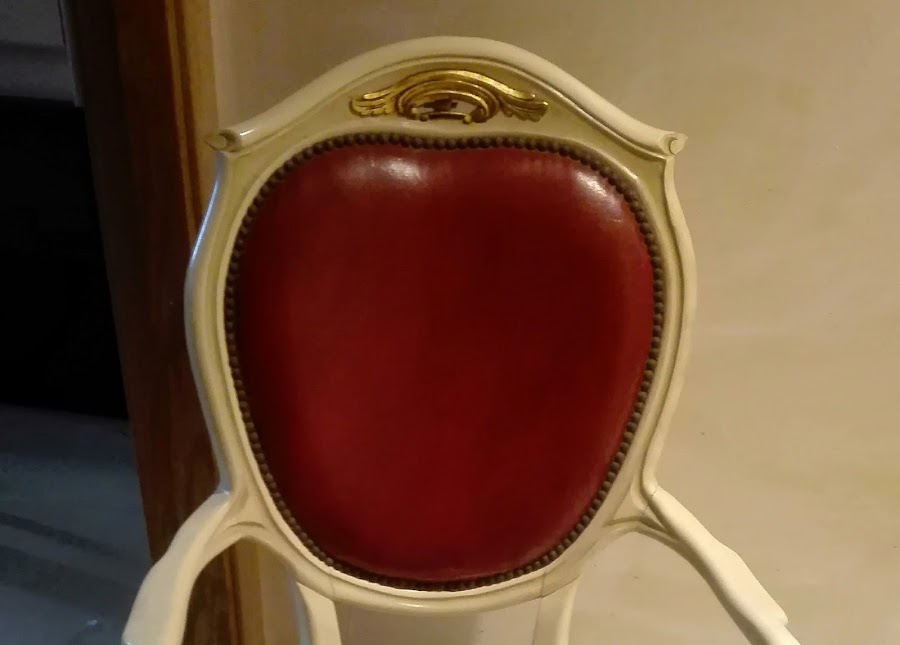 Y así era. Estaba en muy buenas condiciones por lo que no necesitaba mucha restauración, más bien un pequeño reciclaje. Está pintada totalmente de nuevo. El color aunque parezca el mismo no lo es, lo hace la luz, el original era en blanco, blanco. Demasiado para mi gusto. La espalda y el asiento eran de piel granate. Me daba muchísima pereza retapizarla, sobre todo porque estaba impecable la piel. Así que decidí pintar la piel con pintura a la tiza, había leído que quedaban estupendas y así ha sido.