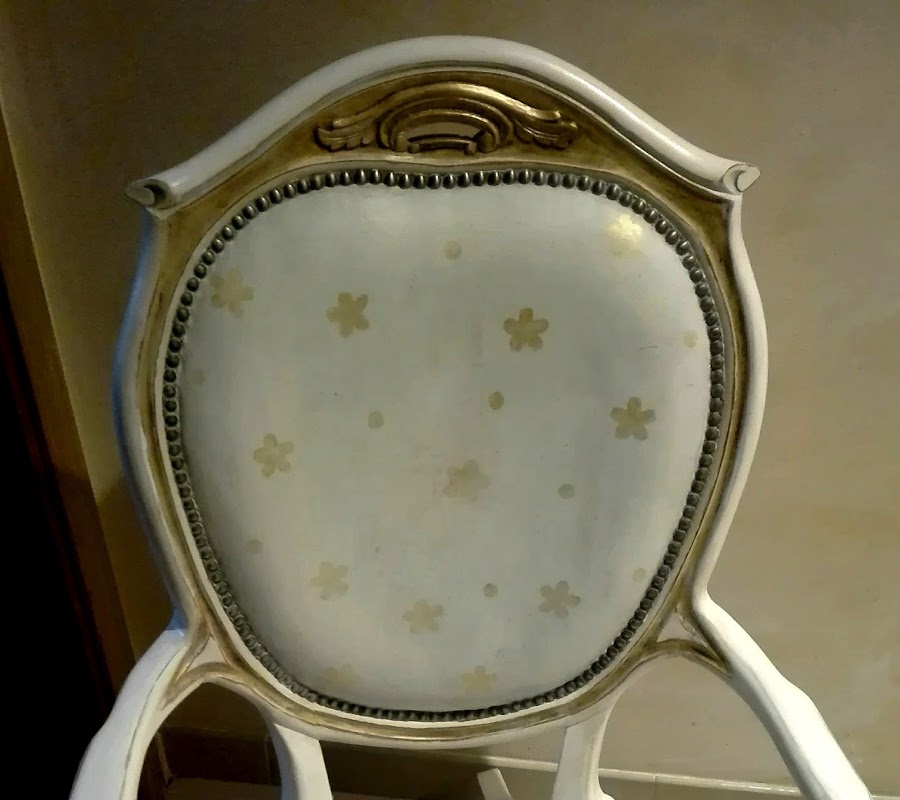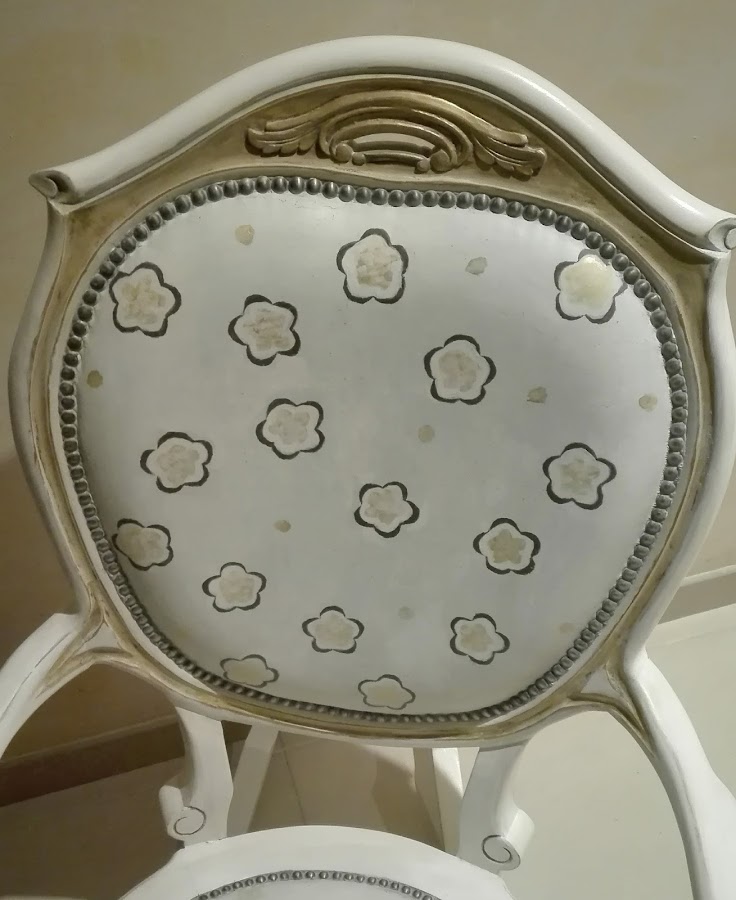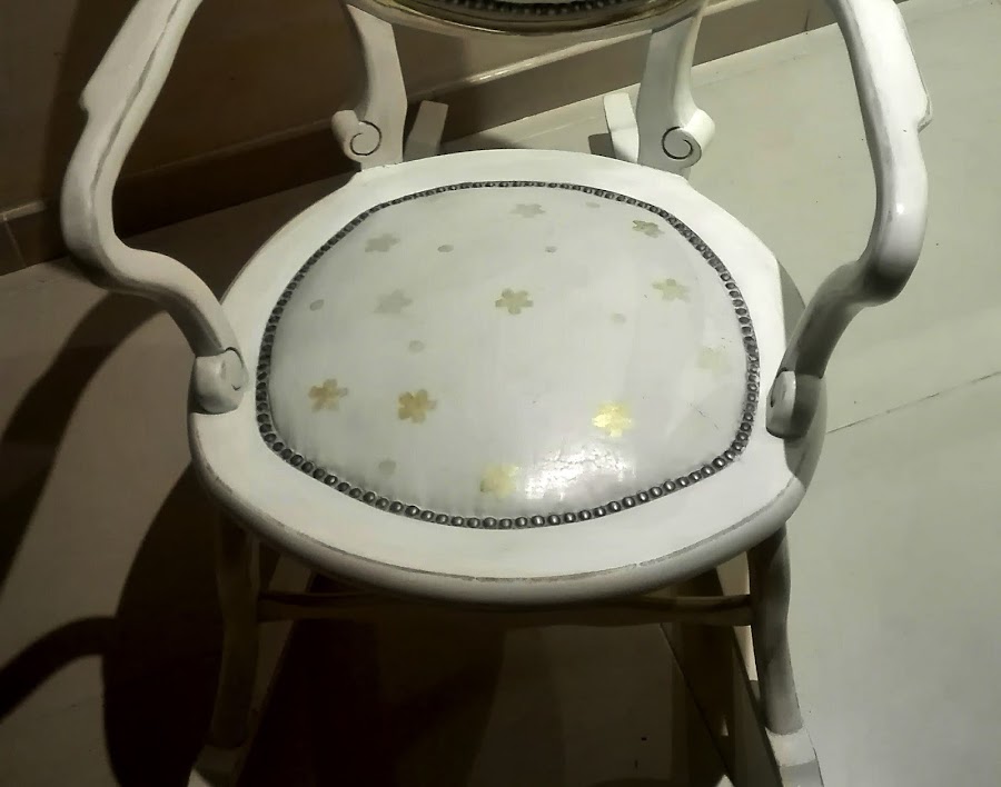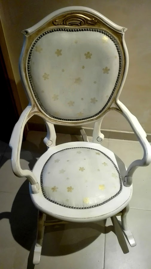 La mecedora esta pintada con pintura a la tiza. Chalk Paint. Estampado con flores doradas, realizado con tampones. Primero probé con una flor sencilla, como se ve en la foto, pero me pareció demasiado sosa.