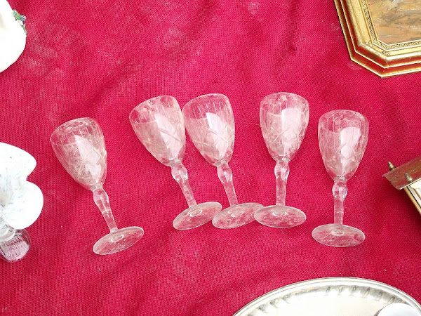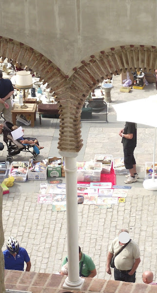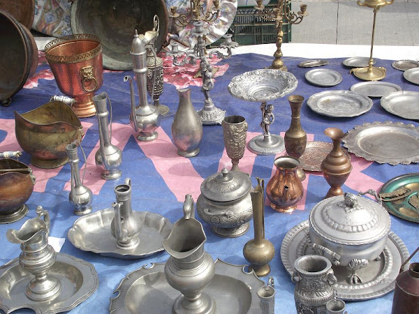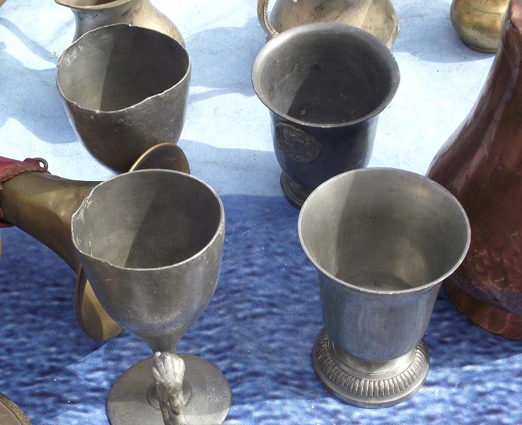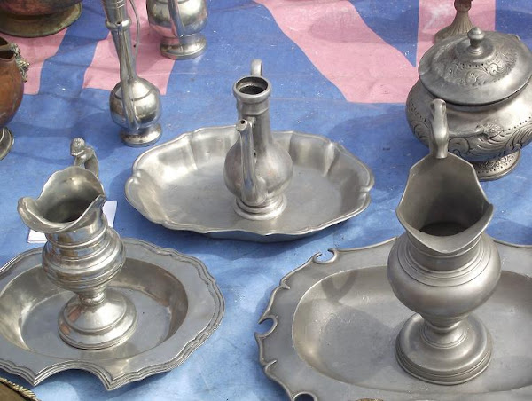 En este puesto encontré una buena cantidad de cacharros de estaño, preciosos y en muy buen estado: platos, jarras, copas...hasta una jofaina de barbería con su jarrita (se ve en la esquina inferior izquierda, que el platito tiene una hendidura para colocar en la garganta mientras se afeita al cliente):
