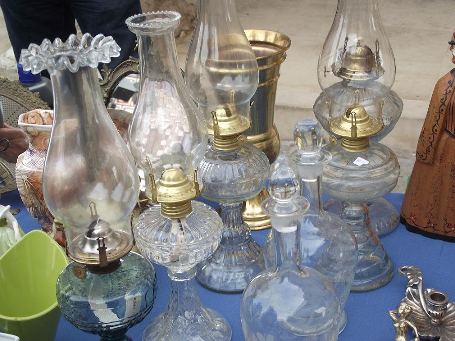 Damajuanas de cristal blanco y verde,y garrafas de vino en sus forros de mimbre; quinqués de distintos tamaños y formas: