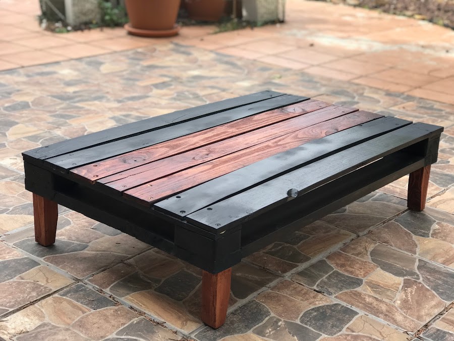 He rescatado de mi jardín una mesa que tenía hecha con un palet y unas patas en cruz. Esta mesa ha ido rulando por la familia al menos 8 años. A mi me llego con ruedas y un cristal y yo la fui modificando a mi gusto.