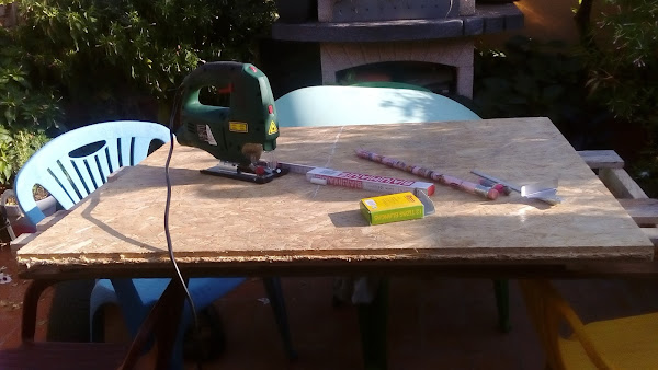 2º Corto a medida la madera del sobre, una madera de viruta prensada, a la cual le he dejado su correspondiente código de barras para que sea un poco mas "irreverente", jeje