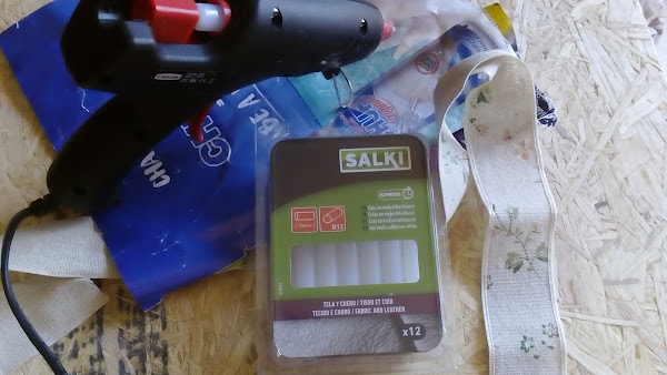 4º Para decorar los cantos, he optado por ponerle un bonito vivo de tela de saco con sencillos motivos florales. La pego con pistola, con silicona especial para telas.