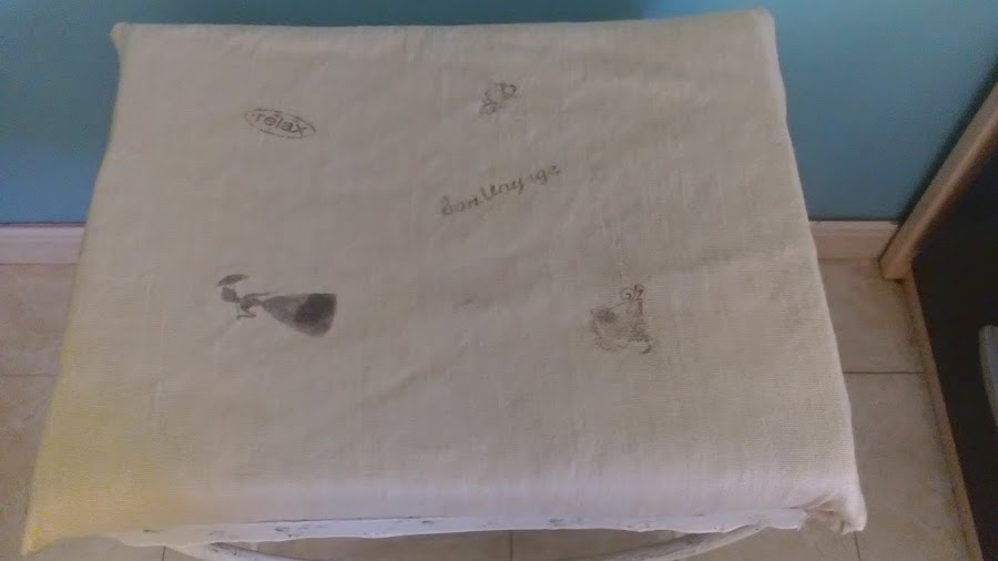 7º Ahora vamos a la 2ª parte, el asiento. Recorto un trozo de espuma para asiento, y también tela de una especie de tela de saco, que tenía de un viejo estor, todo a la medida.