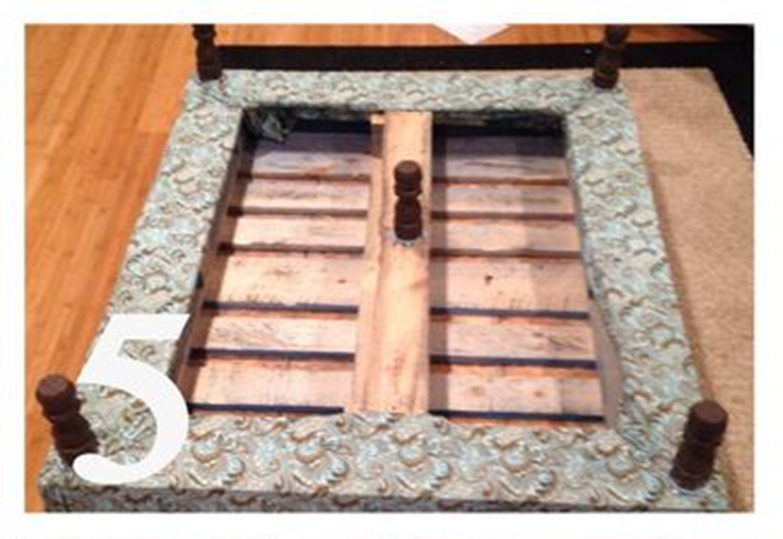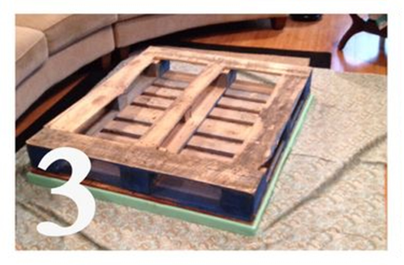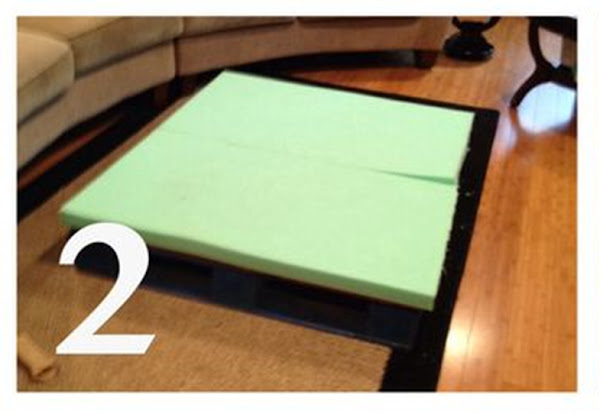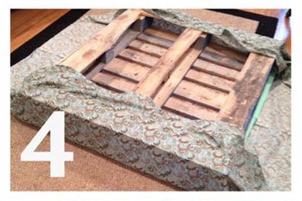 En el paso 3 debemos ubicar la tela en una superficie plana y sobre ella el pallet invertido con la goma espuma, de este modo estaremos seguras que nos alcanzará la tela para todos los lados.