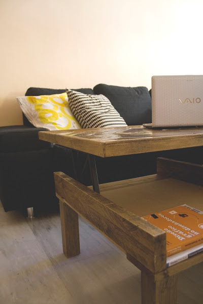 ¿Cuáles son las características que distinguen esta pieza? En primer lugar es una especie de estantería, sí, la propia mesa tiene una altura de dos tablas separadas donde podemos guardar cantidad de cosas, para libros y el portátil por ejemplo viene genial. En segundo lugar, como antes os dije, nos gusta cenar en el salón, rara costumbre si quizá quien me lee no es de España (o eso creo yo!), la mesa de café si es baja siempre es súper incómodo cenar ahí, así que quisimos hacer la tabla superior elevable incorporando un par de bisagras.
