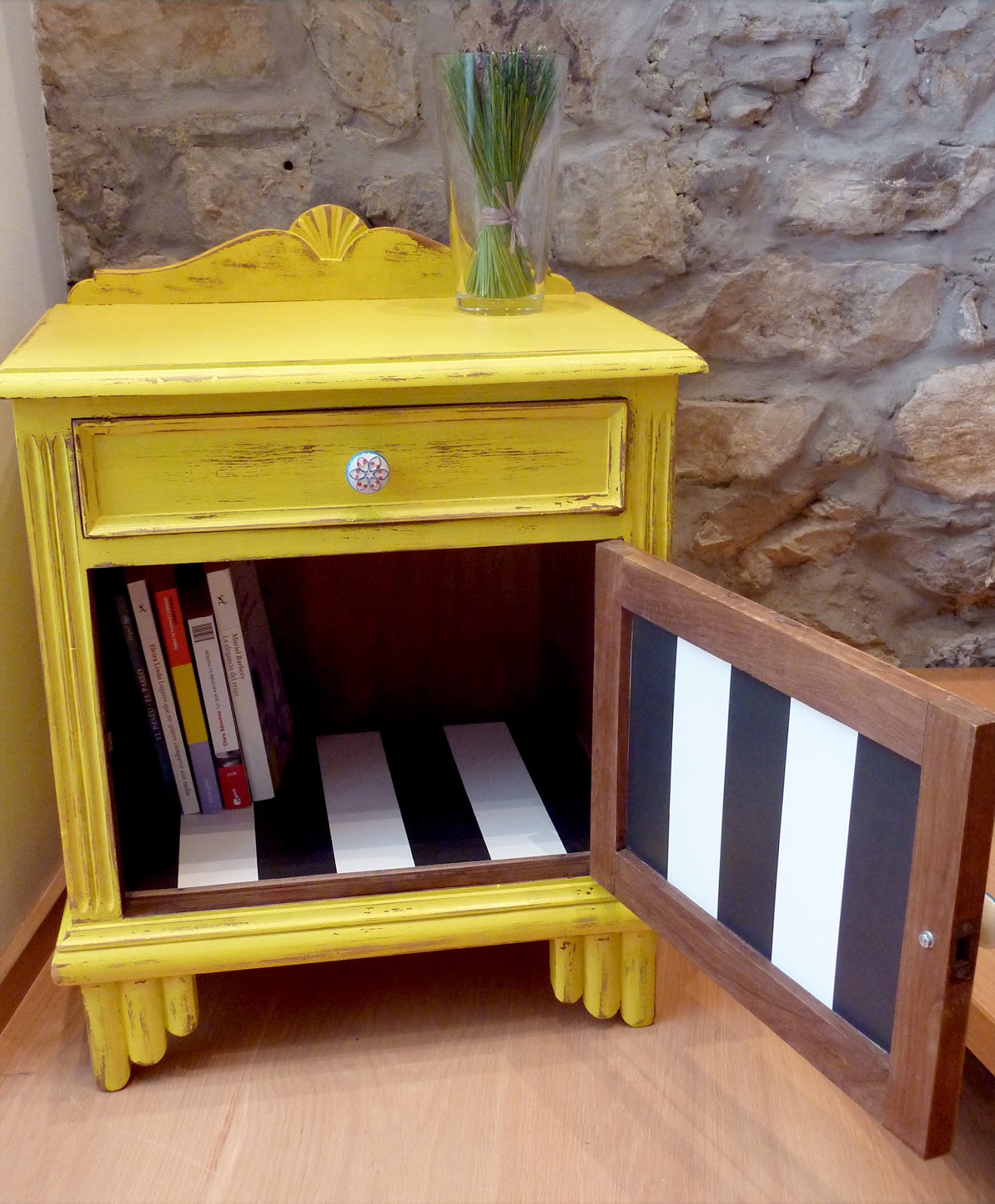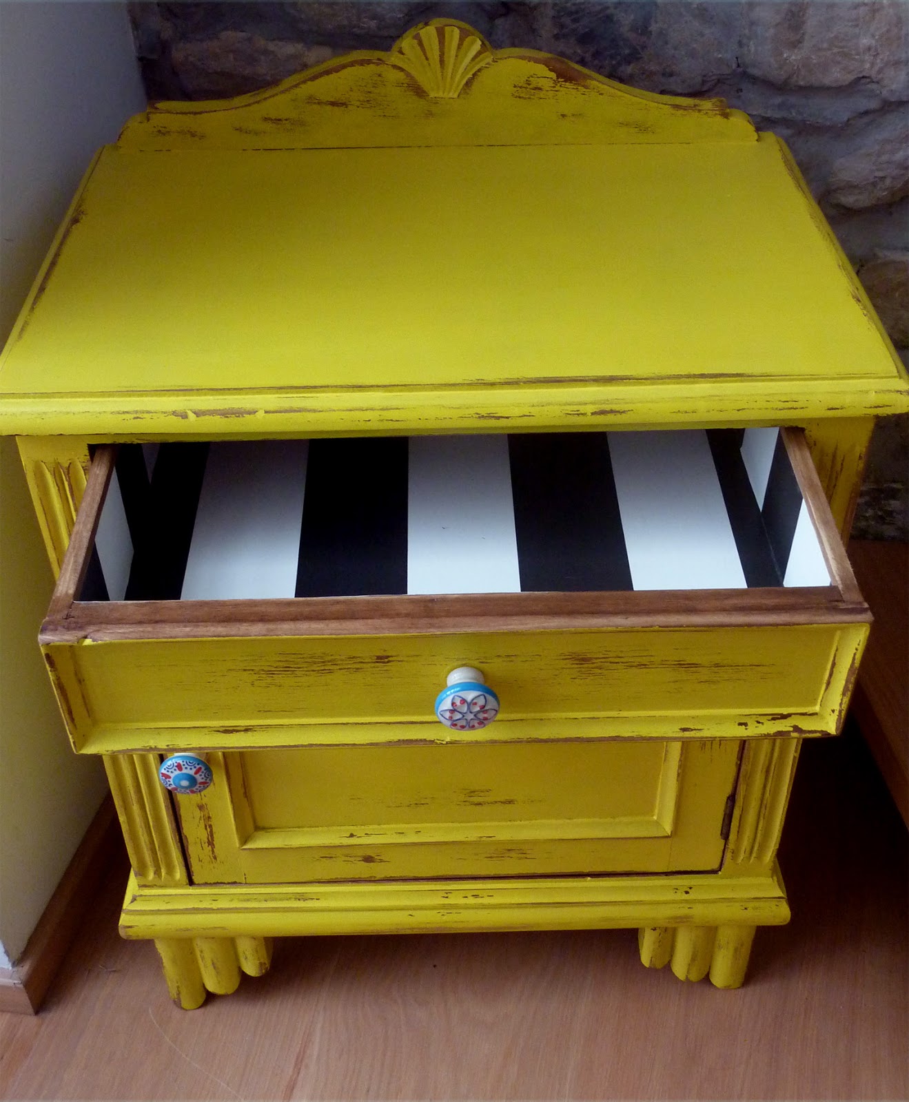 Y forramos el cajón y el interior con papel de rayas blancas y negras