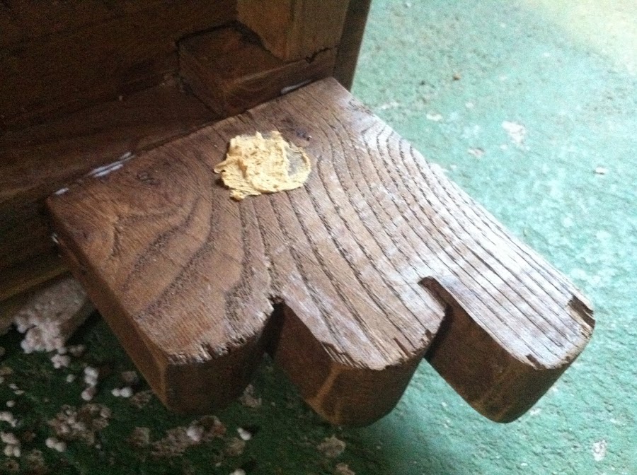 ¿No es preciosa? Pero el tiempo deja huella, así que tuvimos que repararla utilizando masilla para madera para rellenar los huecos. Lo dejamos secar y lijamos.