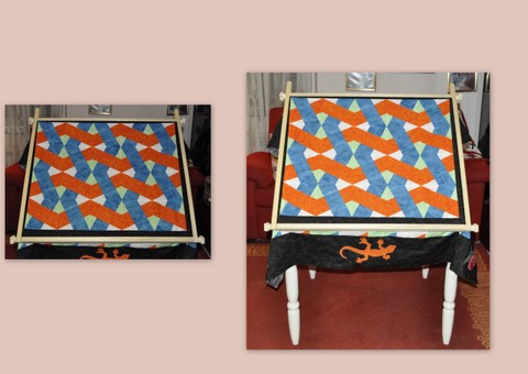 Aquí arriba detalle de la decoración de la mesa.Despues de tenerla acabada pensó mi esposa en la posibilidad de convertir la mesa en un bastidor,osea que se pudiera quitar el tablero y poner un bastidor donde ella poder trabajar comodamente y me puse de nuevo manos a la obra y la cosa quedó asi: