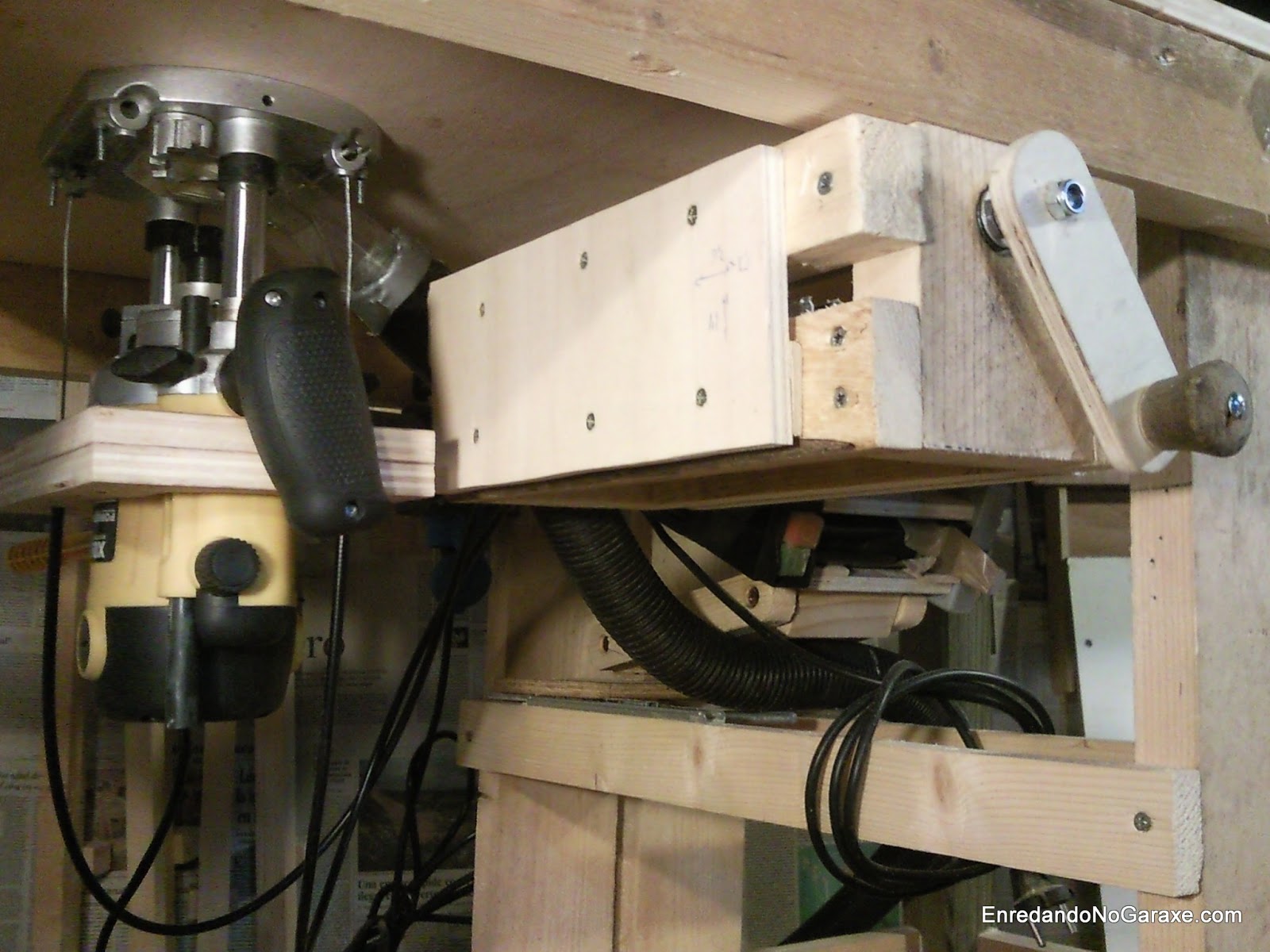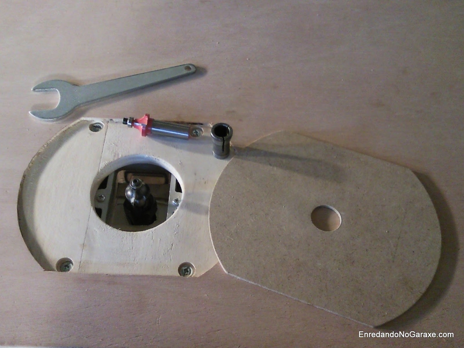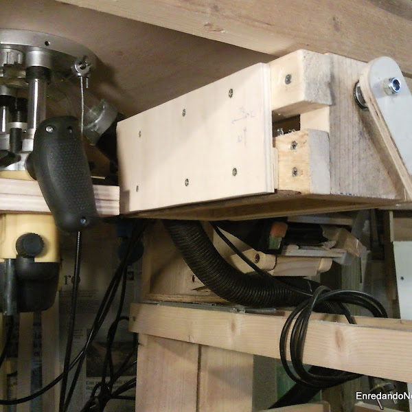 Acoplar la fresadora portátil a una mesa no supone mucha dificultad, le quitamos la tapa de plástico de la base y la usamos de plantilla para hacer los agujeros en el tablero. Buscamos unos tornillos largos del diámetro de los que usa la tapa que acabamos de quitar, los cortamos a la medida que necesitemos y hacemos un rebaje para las cabezas de los tornillos en la parte superior del tablero. Ya solo queda hacer un agujero en el centro para que pase la fresa y atornillar la fresadora al tablero (cuidado con los tornillos, los primeros que yo usé resultaron ser muy blandos y se rompieron al apretarlos quedando dentro de la base de la fresadora). El problema es regular la altura de la fresadora, por eso antes de nada quise tener listo algún sistema de elevación.