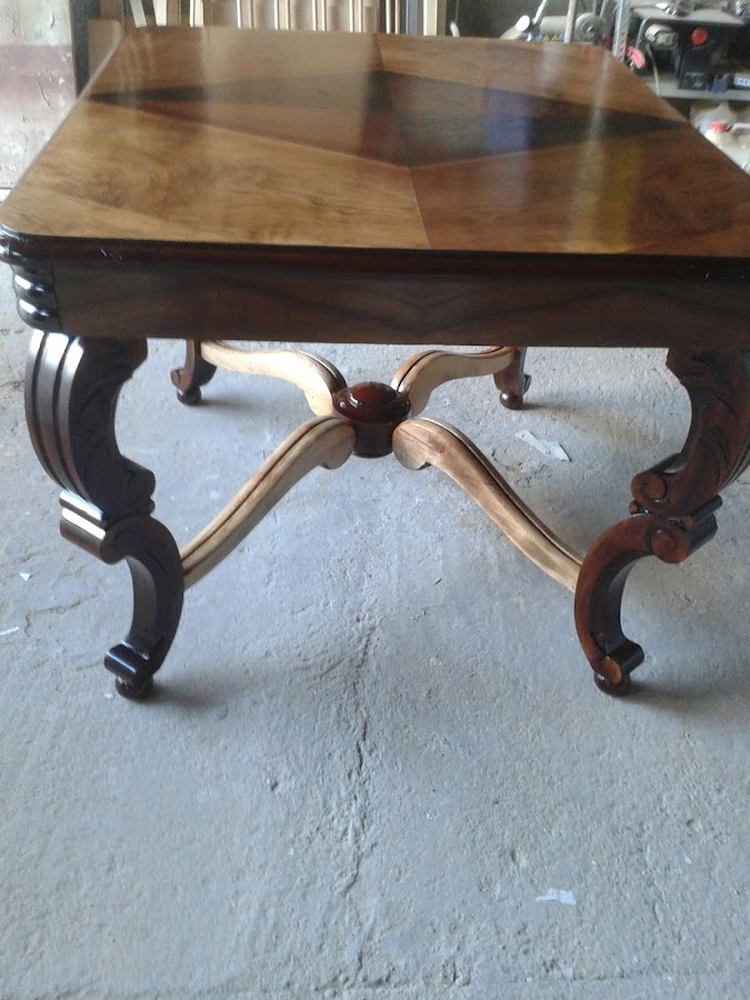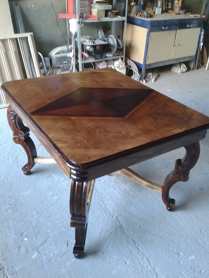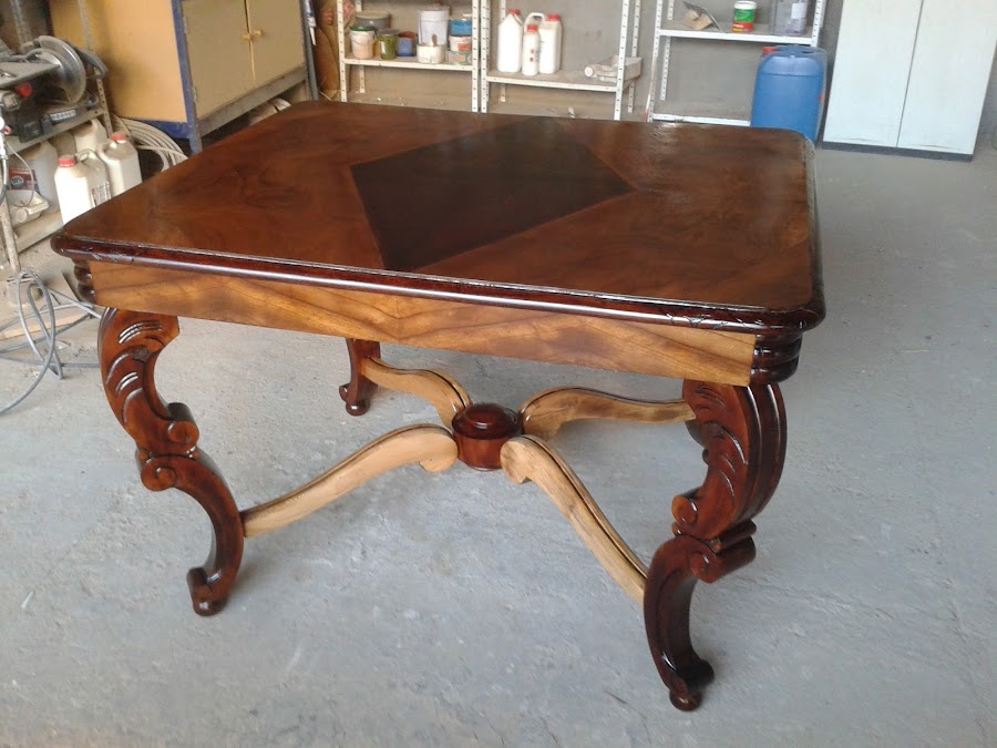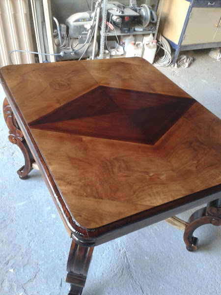 Aquí tenemos un tablero de mesa de nudo de raíz, después de un buen lijado y un teñido claro hemos sacado toda la veta y a quedado muy vistosa. ANTES DESPUES