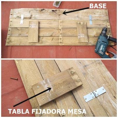 Es sencillo, solo requiere organización y planificación ya que colocarlo en la pared es una tarea tediosa. Para que la mesa abatible quede en forma de L una vez plegada, he colocado bajo ella un taco del palet que sirve a modo de tope (atornillado)