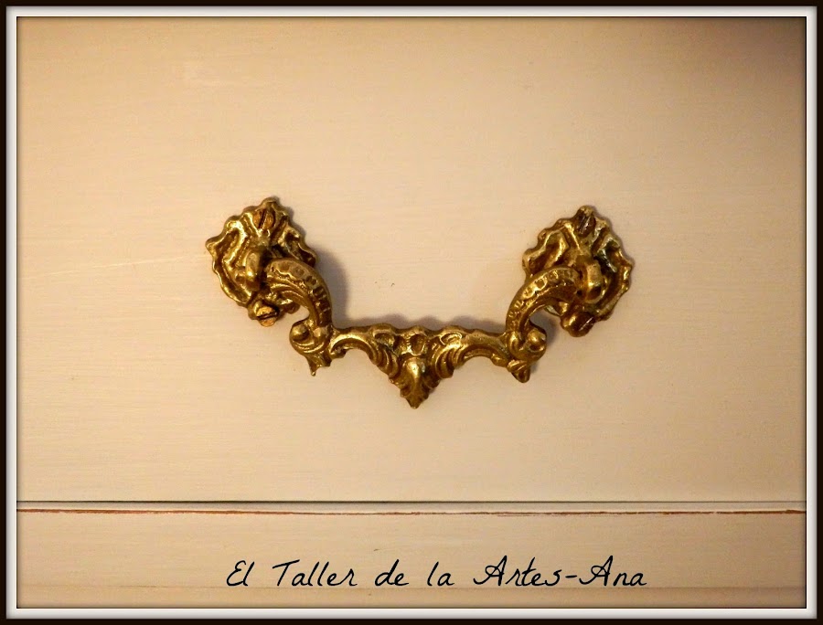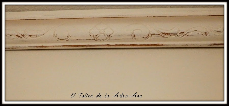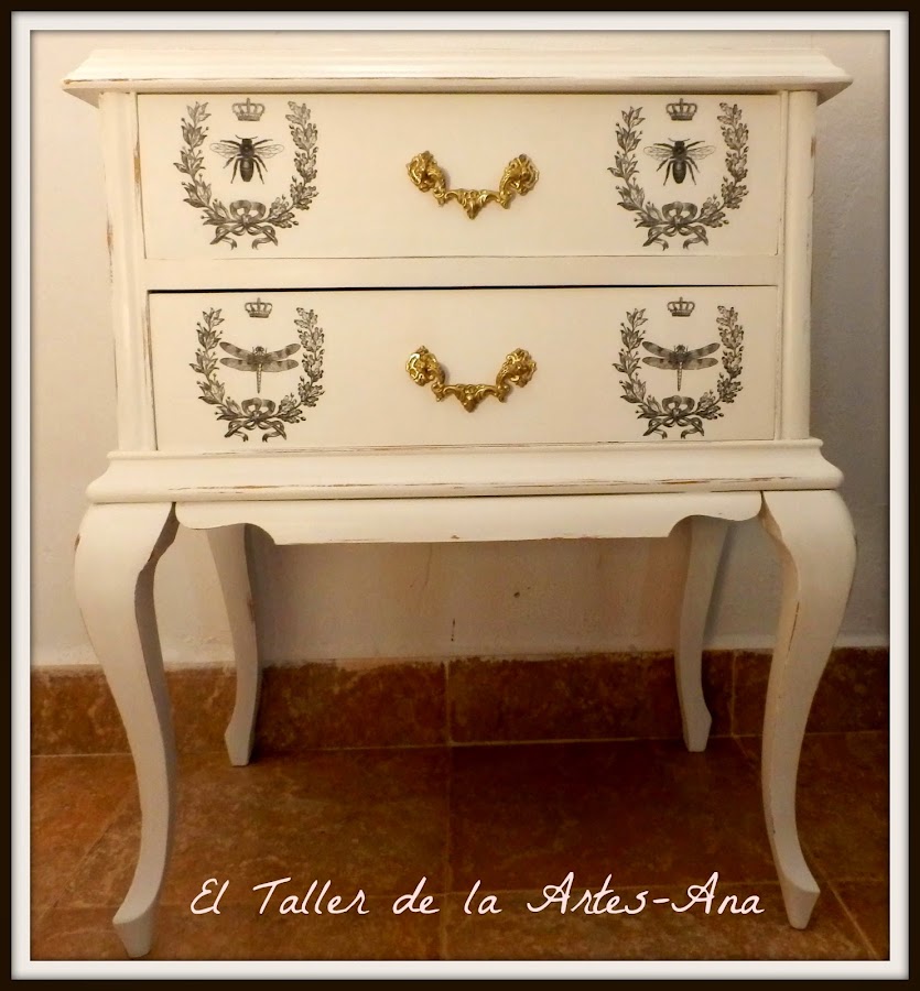 El proceso el de siempre. Un suave lijado ya que no tenía muchas capas de barniz, dos manos de imprimación y tres manos de pintura acrílica blanca. En esta ocasión es blanco casi puro ya que sólo puse unas gotas de marrón y de ocre para romper un poco el blanco. La nota original la ponen los dibujos transferidos que le dan un toque muy romántico y vintage. Para finalizar la protegí con varias manos de cera incolora. A ver si os gusta.