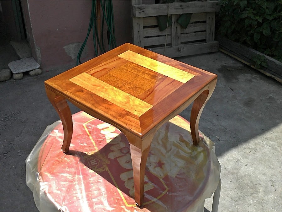Bueno tenia las patas sin retocar, aun tenia todos los trazos marcados de la sierra de cinta, la base de la mesilla se supone que iba a ser pasada en la tupi con una fresa de radio 40, para hacer una curva desde las traviesas asta el final del primer marco de la tapa con el fin de seguir la curvatura de las patas, pero como no dispongo de esa maquinaria, con una fresadora electroportátil le hice un boleado con un fresolín, lije todo y lista para barnizar, la estructura es toda de pino, la tapa es de cerezo, pino e iroco.