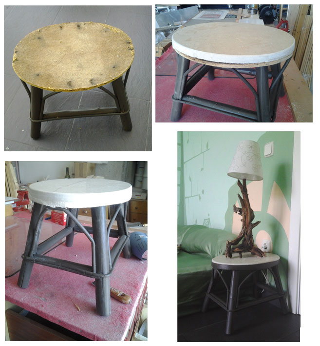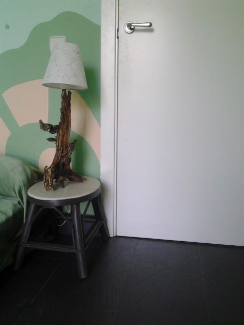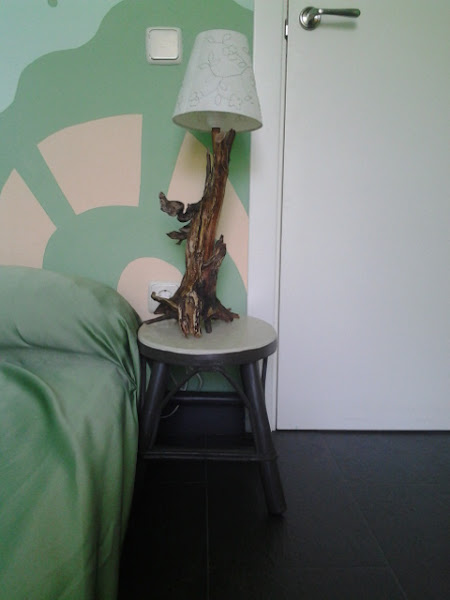 Victor duerme en un futón y le apañado una mesita de noche bajita y pequeña con la lámpara que hice con las raíces de las jaras.