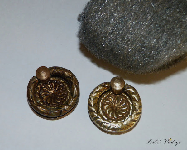 En cuanto a los tiradores, tenía intención de cambiarlos, por eso enmasillé los agujeros antes de lijar los cajones. Sin embargo, después decidí reutilizarlos: en primer lugar, una buena limpieza con lana de acero. Fijaos en la diferencia del antes y el después: