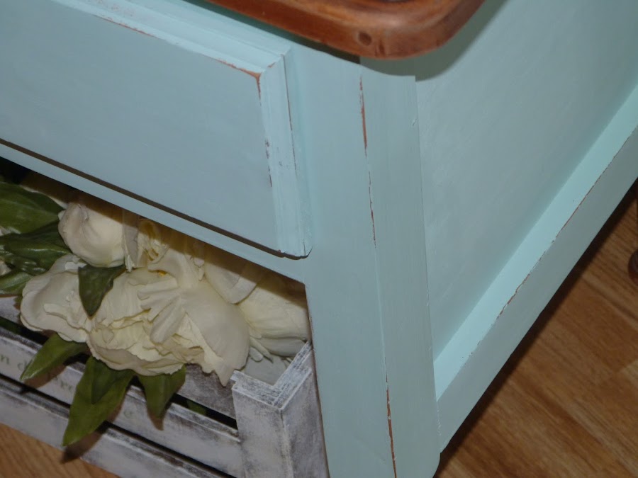 La estructura, pintada con chalk paint verde mint, con algún desgaste en las zonas de roce. Con el tirador del cajón tenía mis dudas... pensé pintarlo del mismo color y desgastarlo mucho, pero finalmente me ha podido ese aspecto tan "vivido" que tiene y simplemente lo he limpiado bien pero sin llegar a quitarle su "solera".