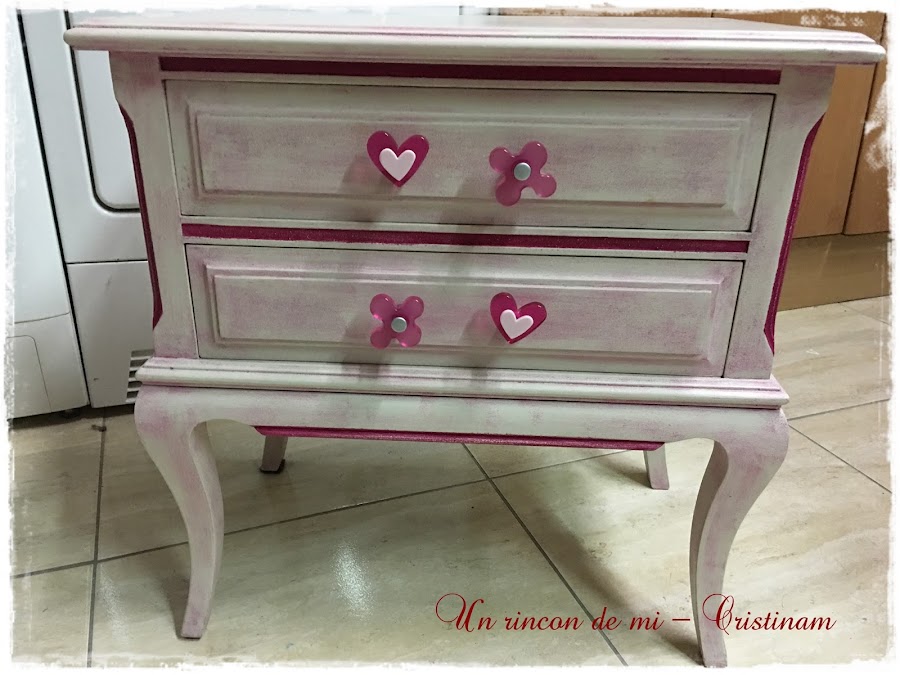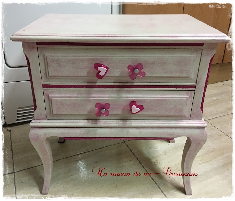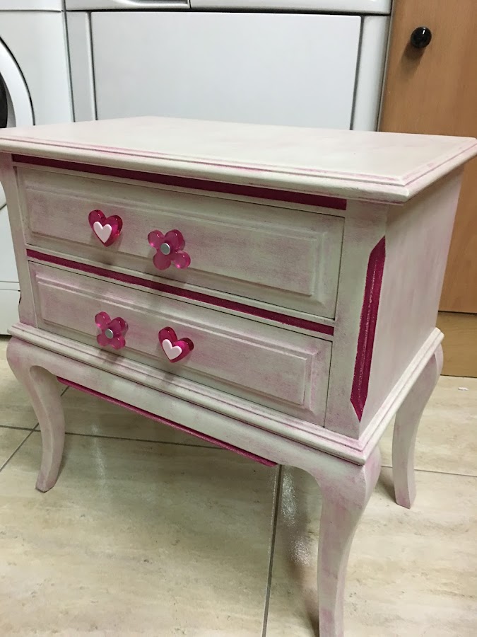 Esta mesilla se la compre en un rastro hace años y la pinte en rosas y fucsias.
