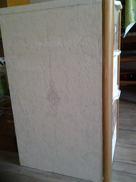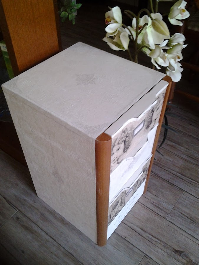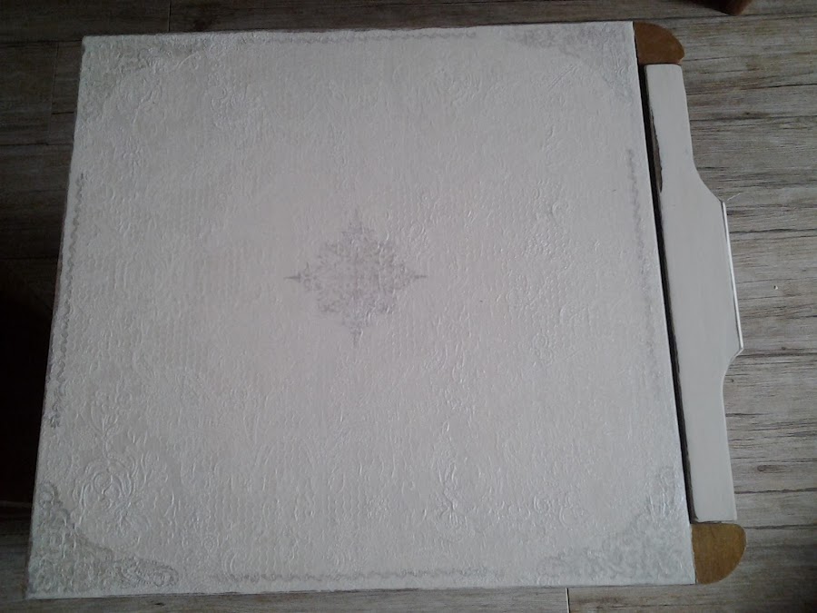 Se trata de una mesilla color miel, la he pintado y la he forrado los laterales con decoupage en relieve, al igual que la parte de arriba.