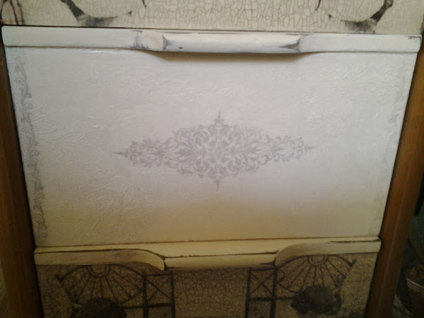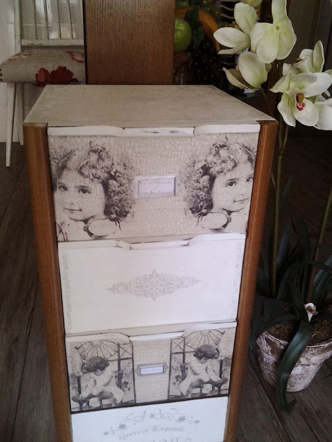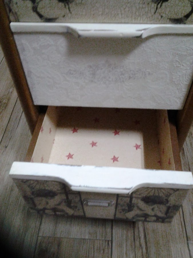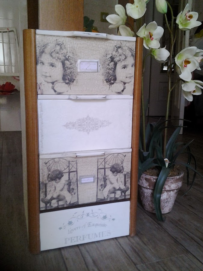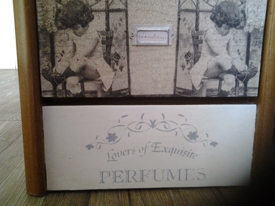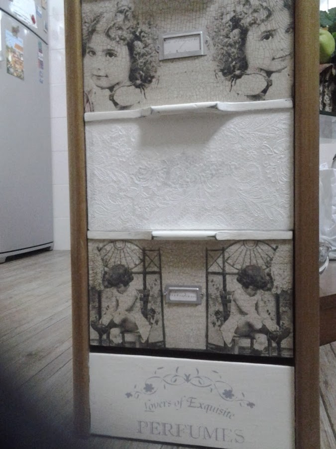 Los cajones son servilletas que compré en la feria de Madrid, craquelados y envejecido con betún y cera.