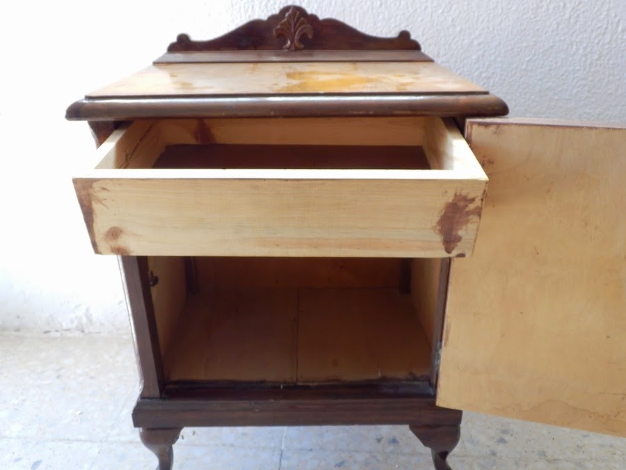Lo primero que quiero transformar es una mesilla de noche que pertenecía a mi suegra y que nos ha regalado recientemente. La quiero poner en la habitación principal. Como tiene que hacer juego con otra que por forma no tiene nada que ver quiero pintarla de blanco roto o azul que es el color principal de la mesita que la va a acompañar. Pero bueno ya iré viendo sobre la marcha...