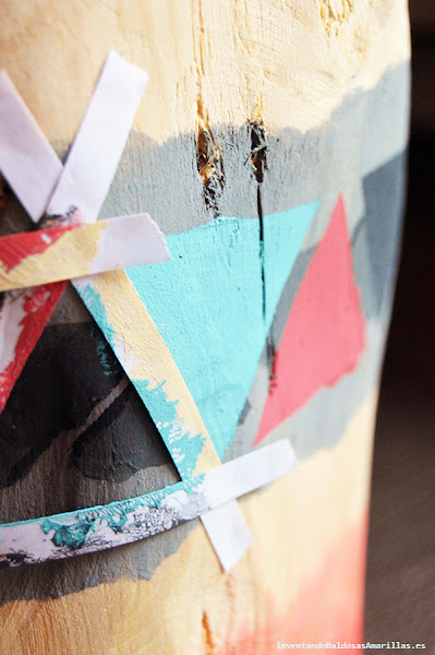 Para decorar mi mesita auxiliar quería hacer algo que fuera muy personal, pero que no cubriera todo el tronco de madera. Opte por unos motivos geométricos, que últimamente están muy de moda.