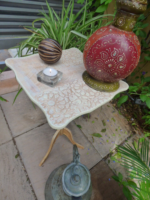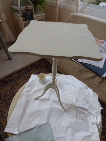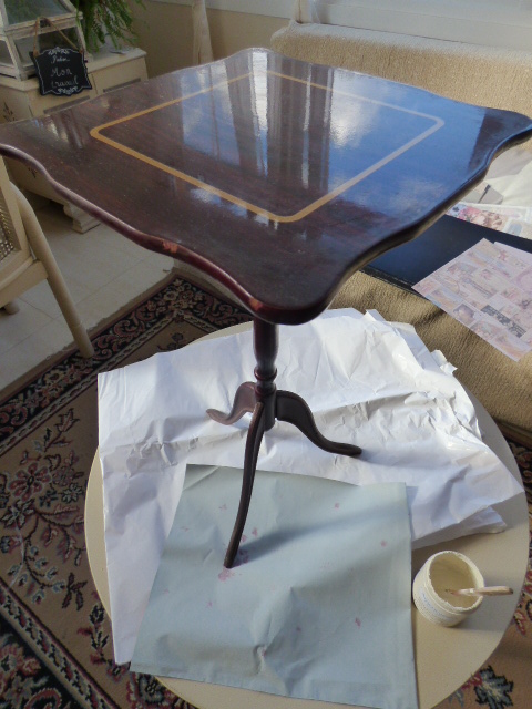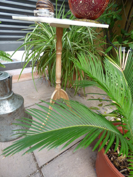 Esta mesita la compré hace muchos meses en un rastro......2 euritos de nada me costó. Aunque imite madera, es de plástico¡